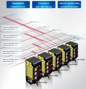 Med denne nye afstandsmåler har Panasonic introduceret et produkt, der er klassens mest kompakte. Takket være den meget præcise CMOS sensormetode, samt et nyt optisk system med indbygget spejl, gør HG-C i stand til at fortage mere nøjagtige og stabile målinger. Med sit tætte helstøbte aluminiumshus egner denne til at blive monteret på bevægelige og udsatte dele. Nye funktioner som TEACH og finjustering gør det let at justere indstillingerne på HG-C serien.